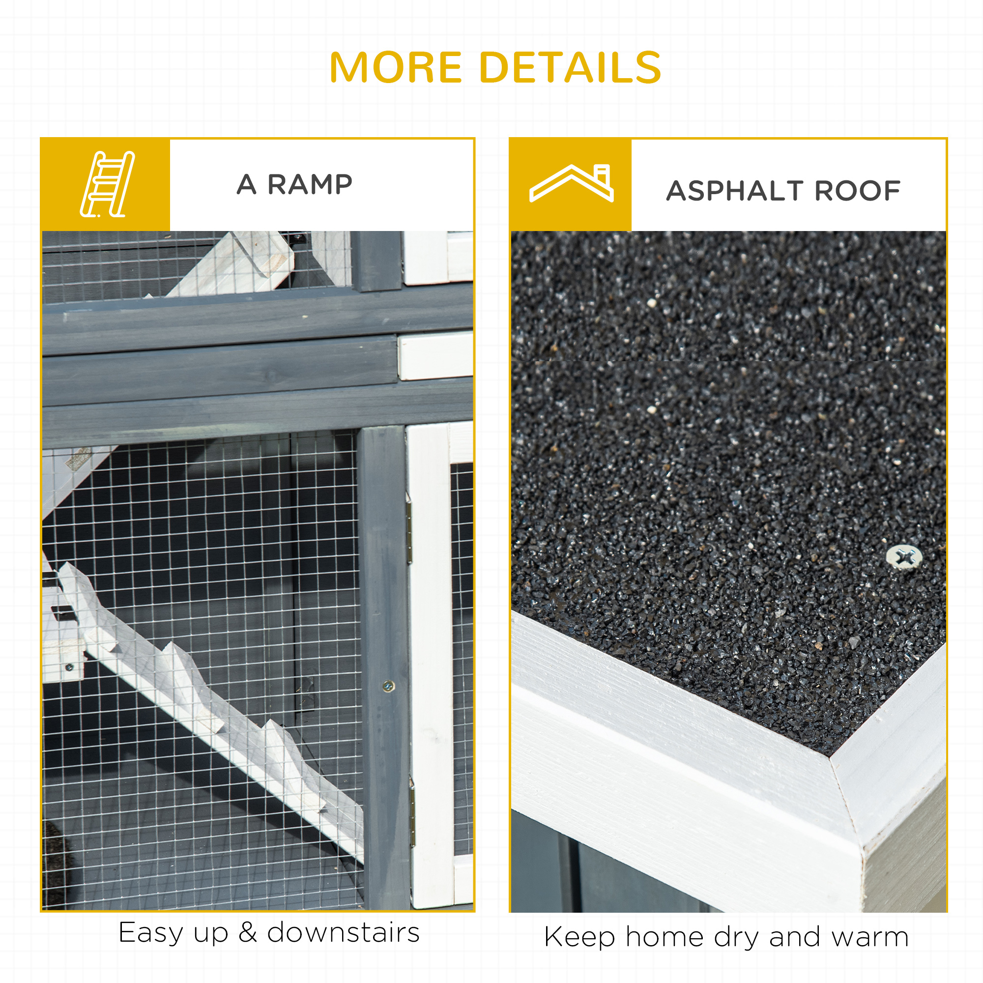 Pets have the freedom to roam in this spacious PawHut guinea pig house. With two tiers – connected by ramps, they'll easily get around, whilst the lockable doors ensure they don't escape. Its raised base prevents dampness in their area, which is well ventilated from the steel wire fence. The water-resistant paint and asphalt roof shelters pets from UV and rain – suitable for gardens. Clean the cage using the multiple doors, openable roof and pull-out tray, so they have a comfortable and tidy home.