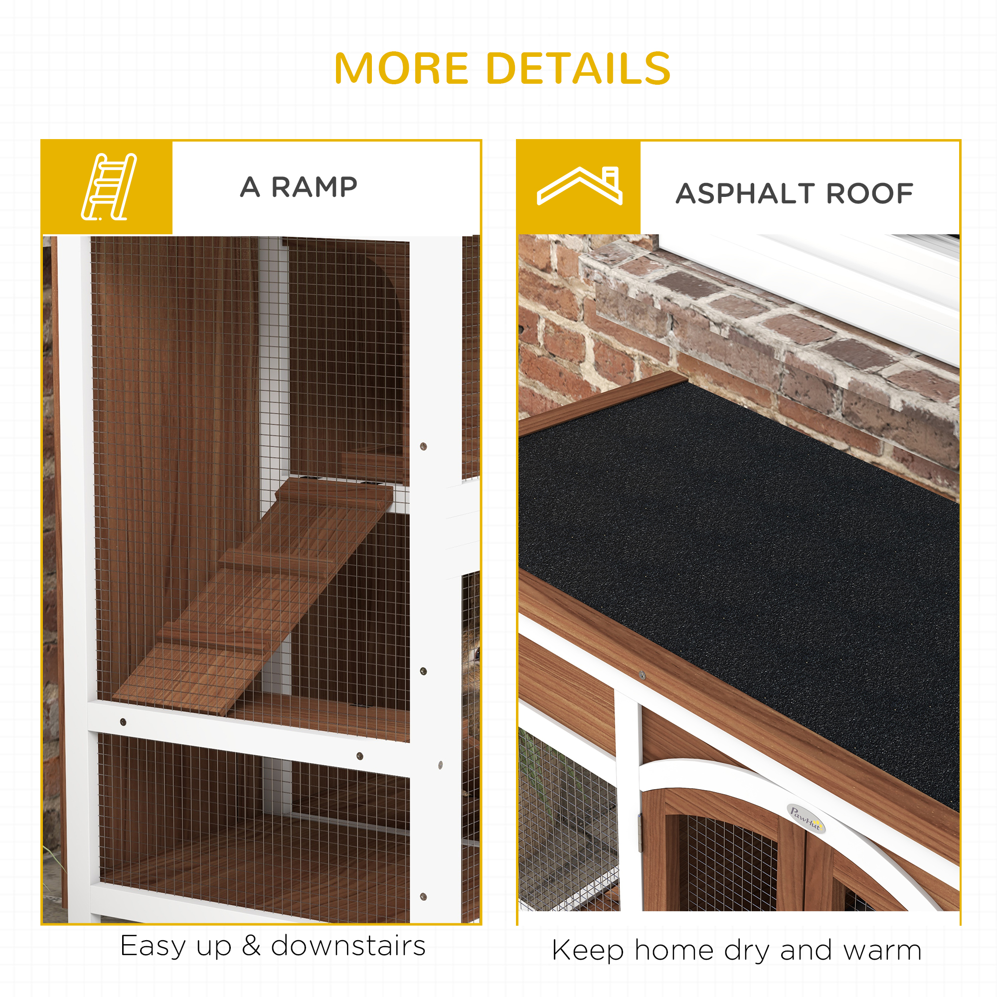 Pets have the freedom to roam in this spacious PawHut guinea pig house. With two tiers – connected by ramps, they'll easily get around, whilst the lockable doors ensure they don't escape. Its raised base prevents dampness in their area, which is well ventilated from the steel wire fence. The water-resistant paint and asphalt roof shelters pets from UV and rain – suitable for gardens. Clean the cage using the multiple doors, openable roof and pull-out tray, so they have a comfortable and tidy home.