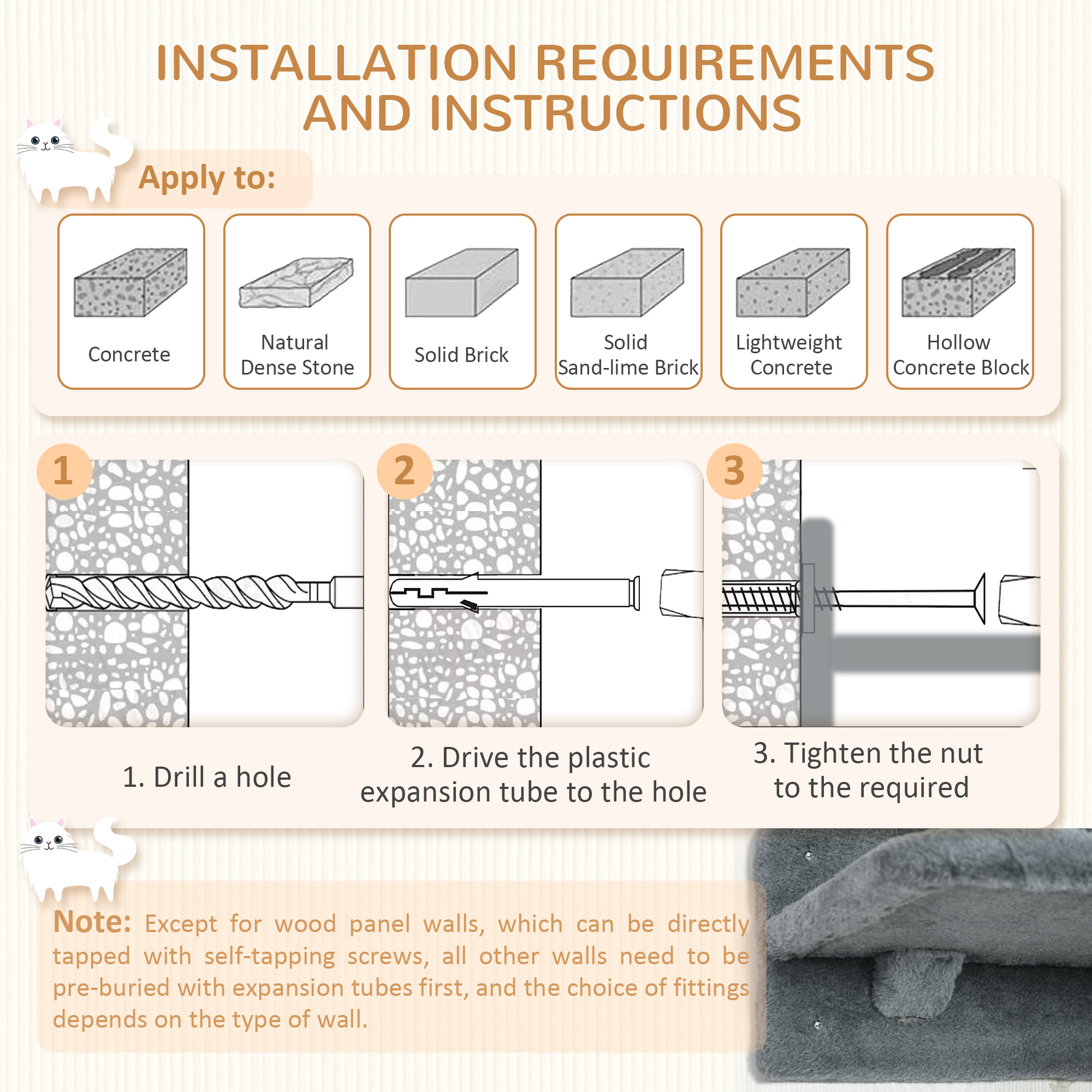 Spark your pet's curiosity with this PawHut cat climbing wall, turning any room into an adventurous and exciting haven. Designed for the wall, it's a comfortable spot for pets to relax and observe – it's also a great space saver. There's a hammock for ultimate comfort, whilst the different platforms keep them active when feeling playful. They'll dig their claws into the scratching posts, deterring them from using furniture. Watch your pets revel in joy; a safe space to become their true selves.