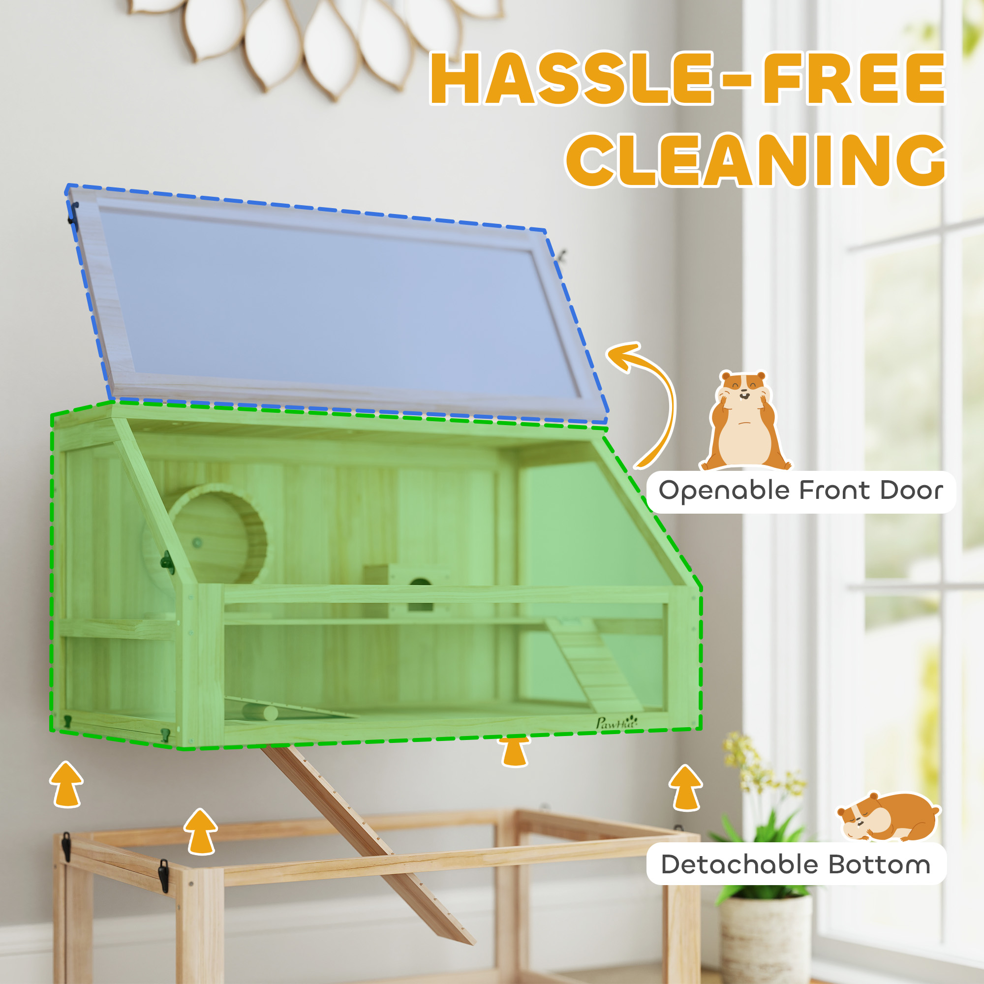Treat pets to a spacious home with the PawHut hamster cage. Featuring three tiers for roaming, it includes a seesaw, ramp and exercise wheel to keep them active. The cosy hut provides a comfortable space for them to relax. With a 31cm deep base for burrowing and clear panels on the front and sides, you can easily watch your pet's antics. Suitable for dwarf hamsters and small gerbils, they'll feel right at home in this large, easy-to-clean habitat.