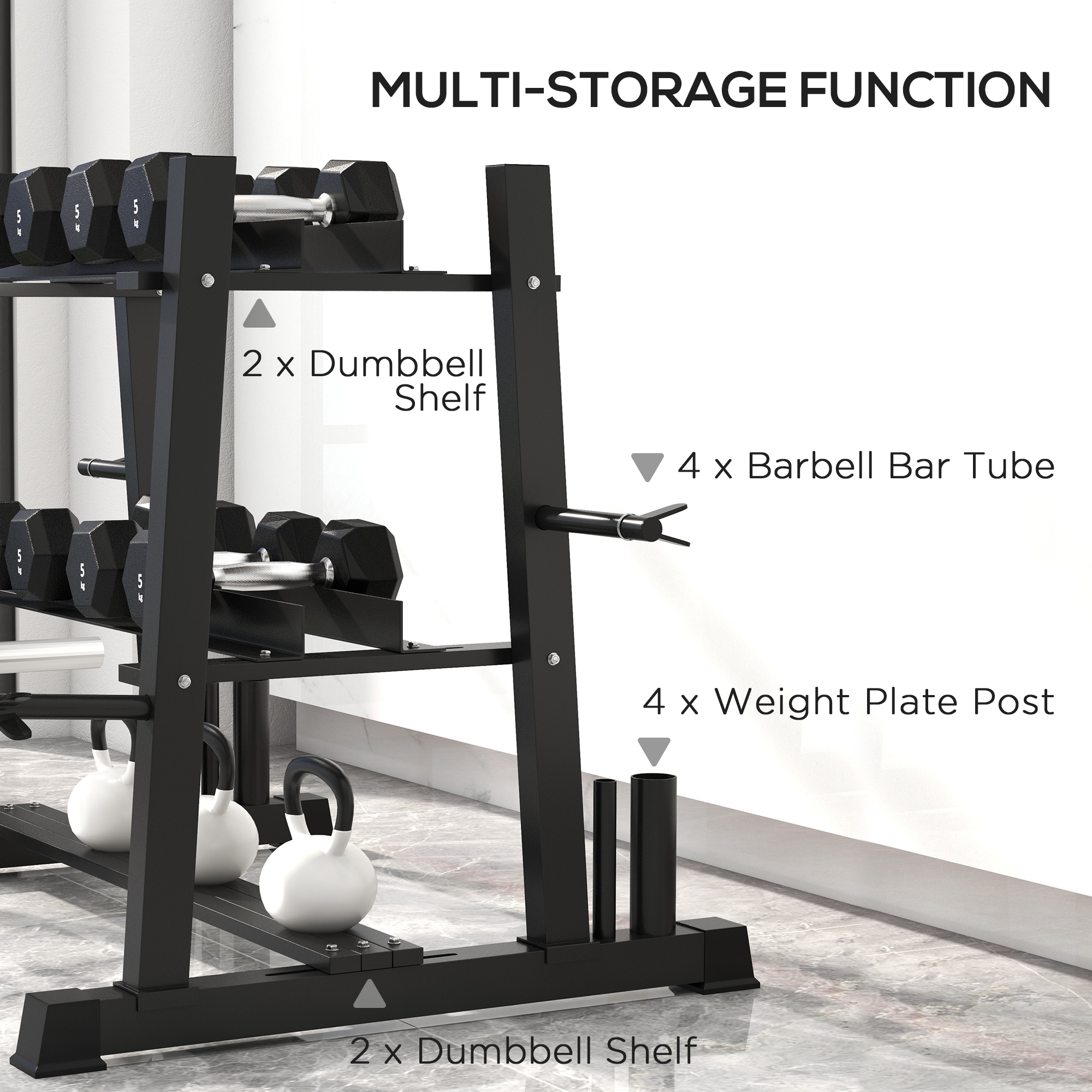 Seeking a neat solution for storing your weightlifting equipment? The SPORTNOW dumbbell rack storage is suitable for organising your workout space! It accommodates dumbbells, kettlebells, weights and barbells all in one spot. Crafted from robust steel, its broad feet ensure stability, preventing any accidents, thus maintaining a secure and organised workout zone.