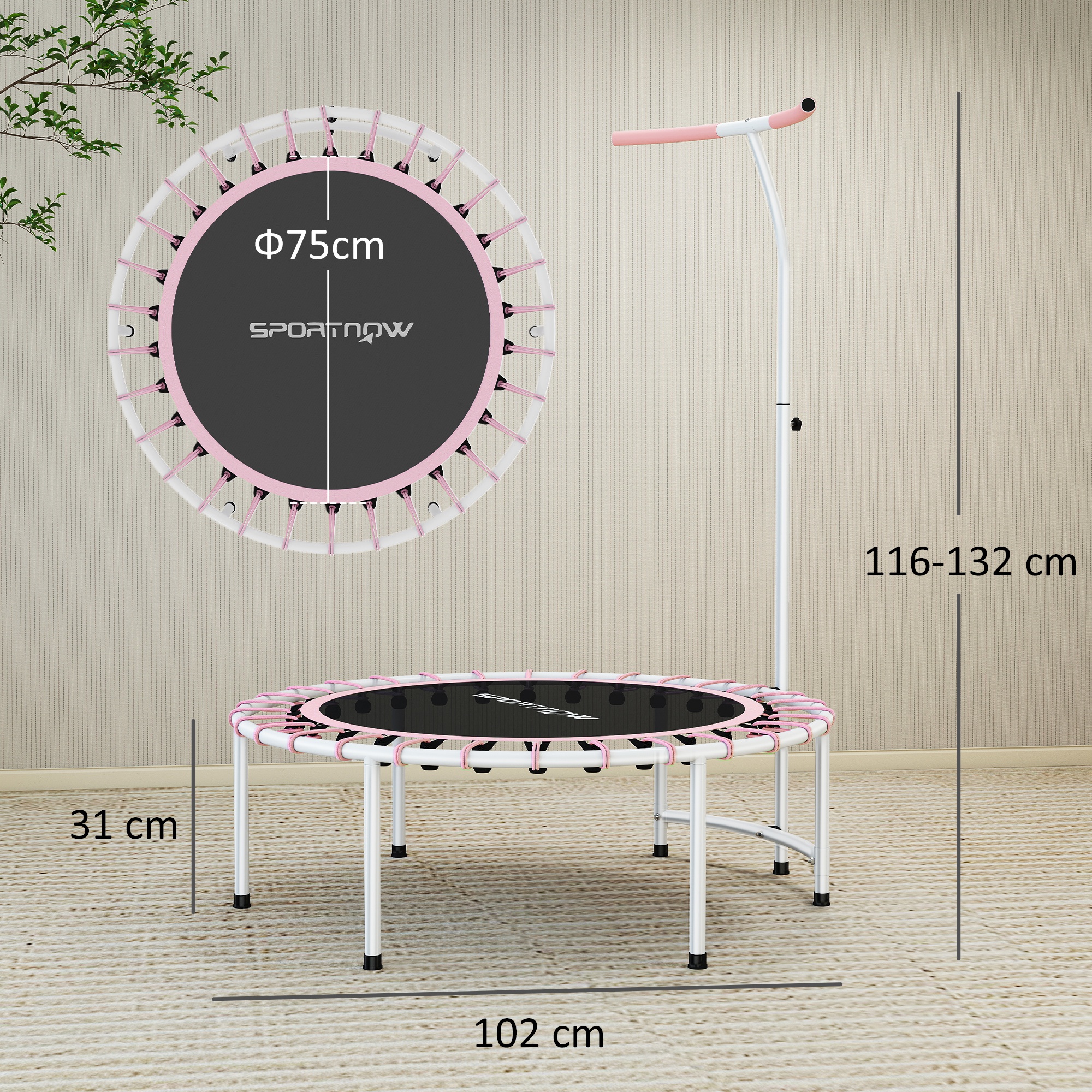 Jump into fun and fitness with the SPORTNOW rebounder trampoline for adults. Designed for full-body workouts at home, this fitness trampoline features 36 bungee cords for a quiet, joint-friendly bounce and a heavy-duty steel frame that supports up to 100 kg. The height-adjustable T-shaped handle adds stability for every jump, while non-slip feet protect your floors. Great for cardio, balance and strength training - all in one compact, family-friendly design.