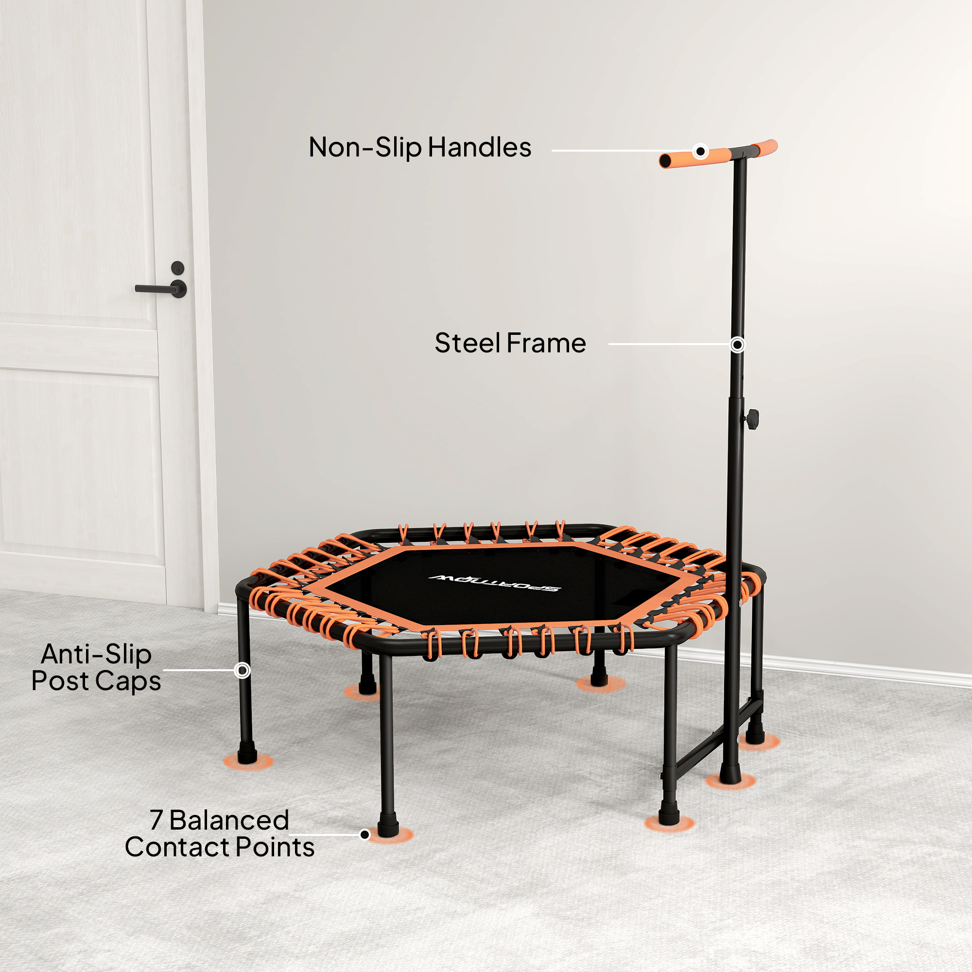 Light up your workout with the SPORTNOW exercise trampoline for adults, featuring colourful trampoline lights in 12 hues and eight dynamic effects controlled by a handy remote. Adjust the fitness trampoline with handle to your comfort and three handlebar heights. Experience a gentle bounce with our bungee cord design, which is great for a low-impact fitness routine on this personal trampoline for adults.