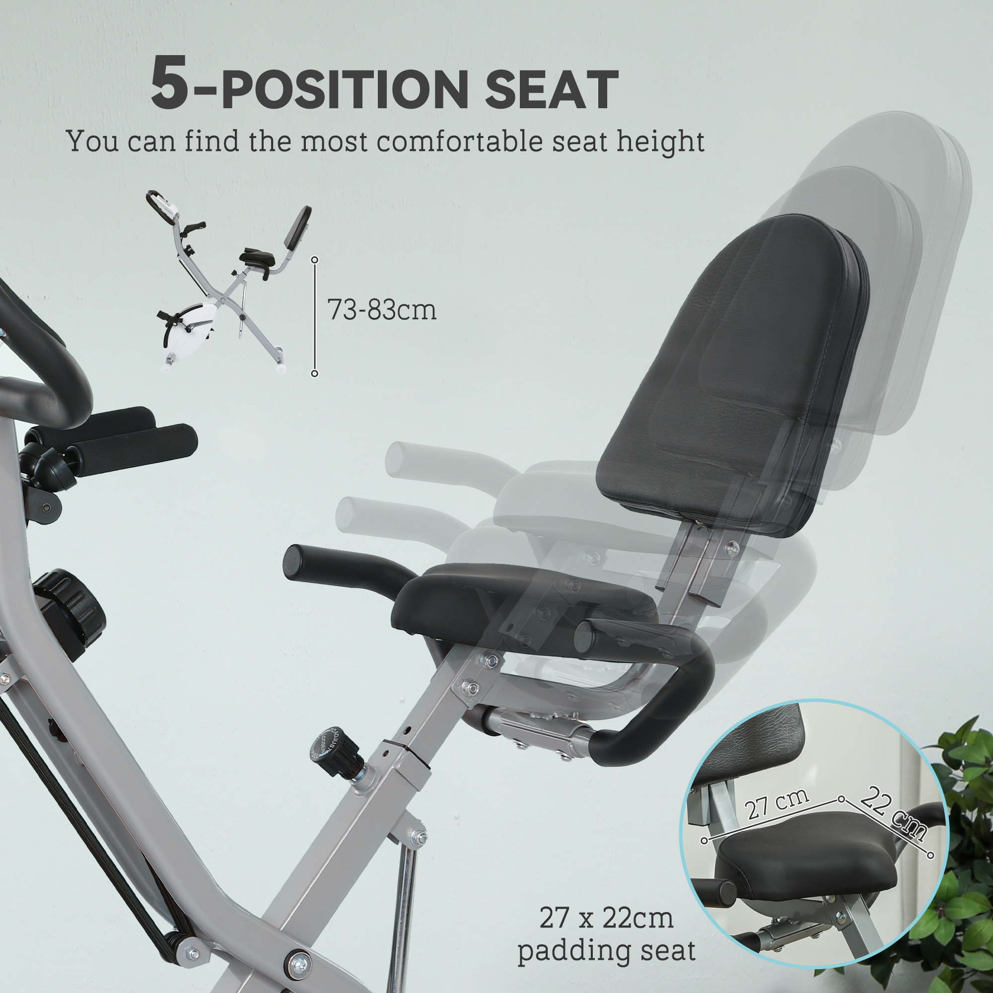 Enhance your fitness with the SPORTNOW foldable bike. Choose from five positions, including recumbent and upright, to tailor your workout. With eight levels of adjustable resistance, you'll control the intensity of a smooth, silent ride. Fold the bike for easy storage and use the built-in wheels for effortless movement. The LCD monitor tracks time, speed, distance and calories, helping you stay on track with your goals. Ready to pedal your way to success?