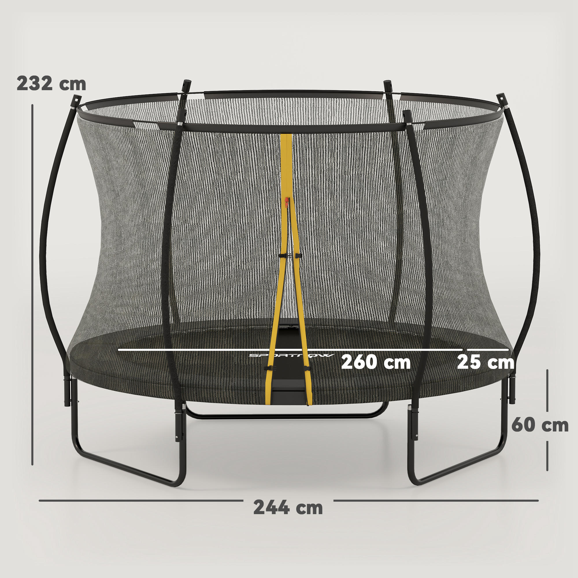 Jump to your heart's content with this SPORTNOW trampoline! Featuring a net and padded curved poles, it keeps you safe inside the enclosure as you jump. Three solid steel U-shaped legs and 42 springs ensure strong and steady bounces, providing enjoyable play. The tight-weave PP mat and external safety pad offer extra protection. The zipped entry allows easy access – great for exhilarating outdoor fun!