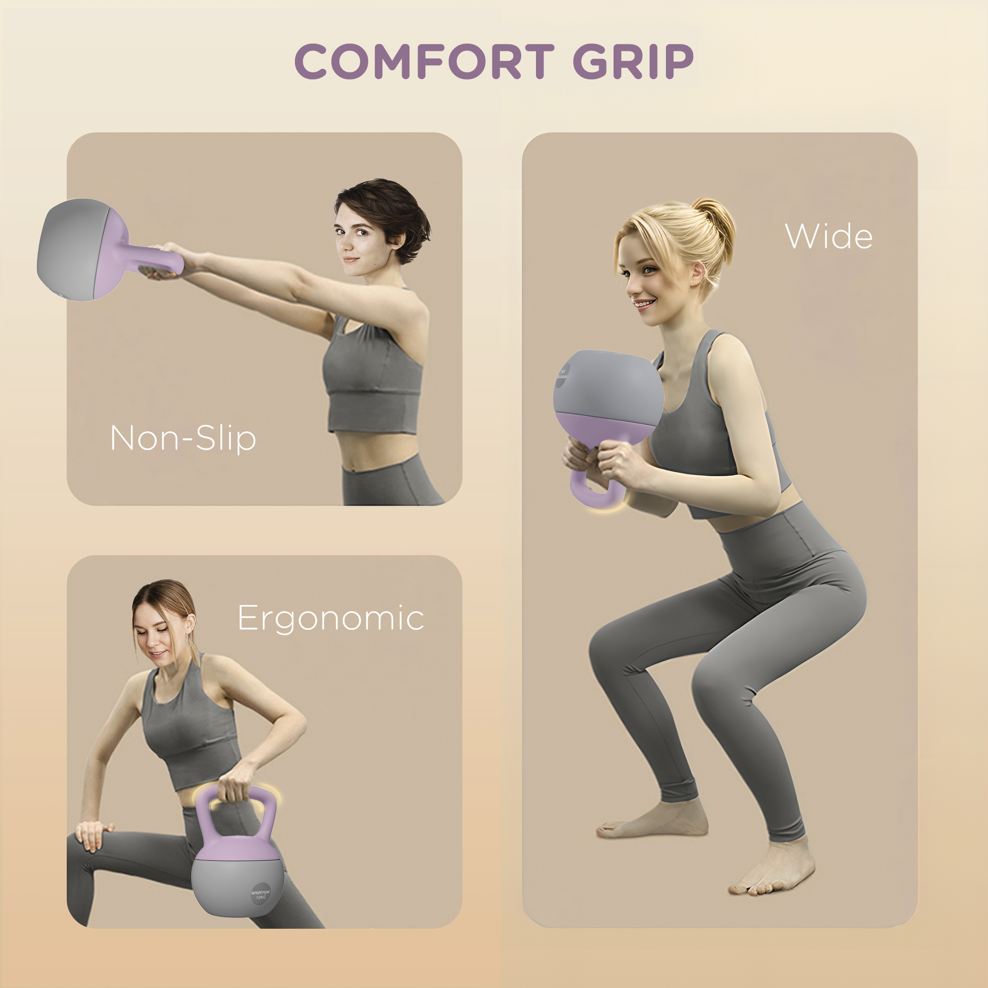 - Wide, ergonomic and non-slip handle, giving you complete control when handling the kettlebell