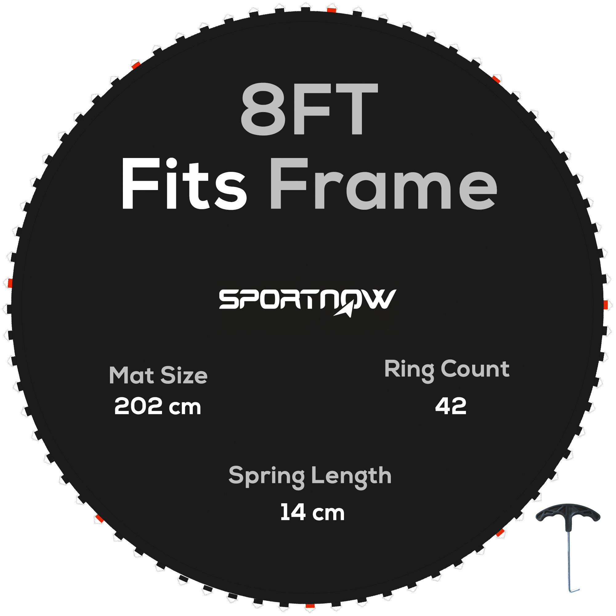- With 42 V-rings included, this mat fits a 8ft round trampoline using 14cm springs
