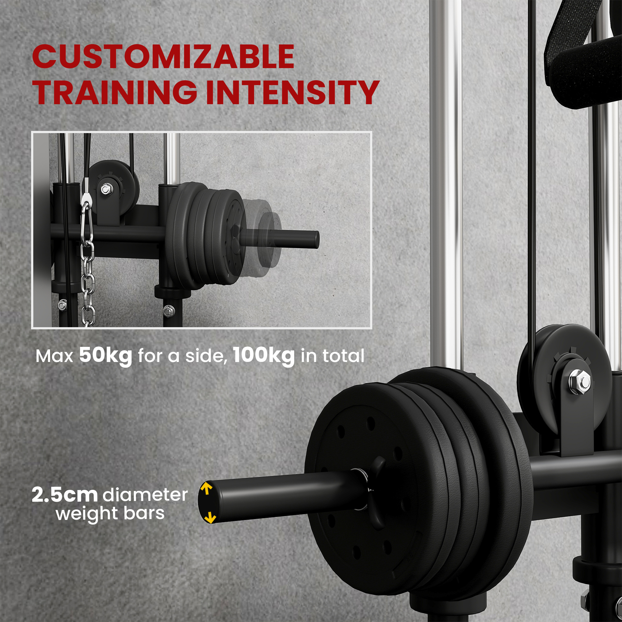 Our weight cable pulley system lets you target multiple muscle groups by changing the height of the dual cable pulley system home gym; you can perform a wide range of bilateral and unilateral exercises to target every muscle group. Get the most out of upper body strength training by allocating gains to multiple groups with a simple adjustment. Designed with robust and load-bearing steel, SPORTNOW smith machine gives you the workout you need to meet your goals.