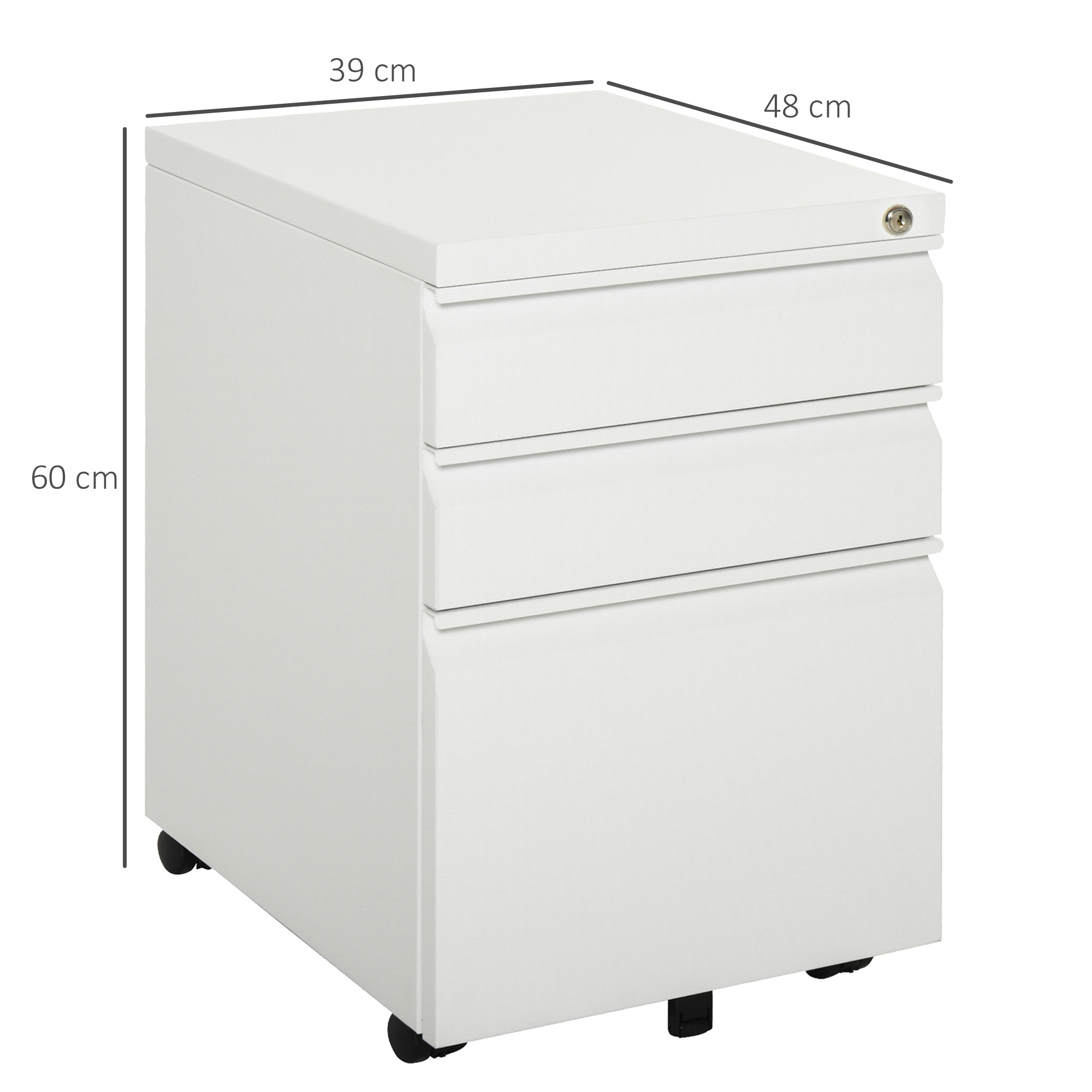 Transform your workspace with the metal filing cabinet from Vinsetto, the lockable drawers with a flat top surface that double as a printer stand. This compact three drawer filing cabinet fits snugly under your desk, featuring a top lock for security and smooth-rolling casters for easy mobility. Organise effortlessly with adjustable rails for three file sizes, ensuring everything you need is just a quick drawer pull away.