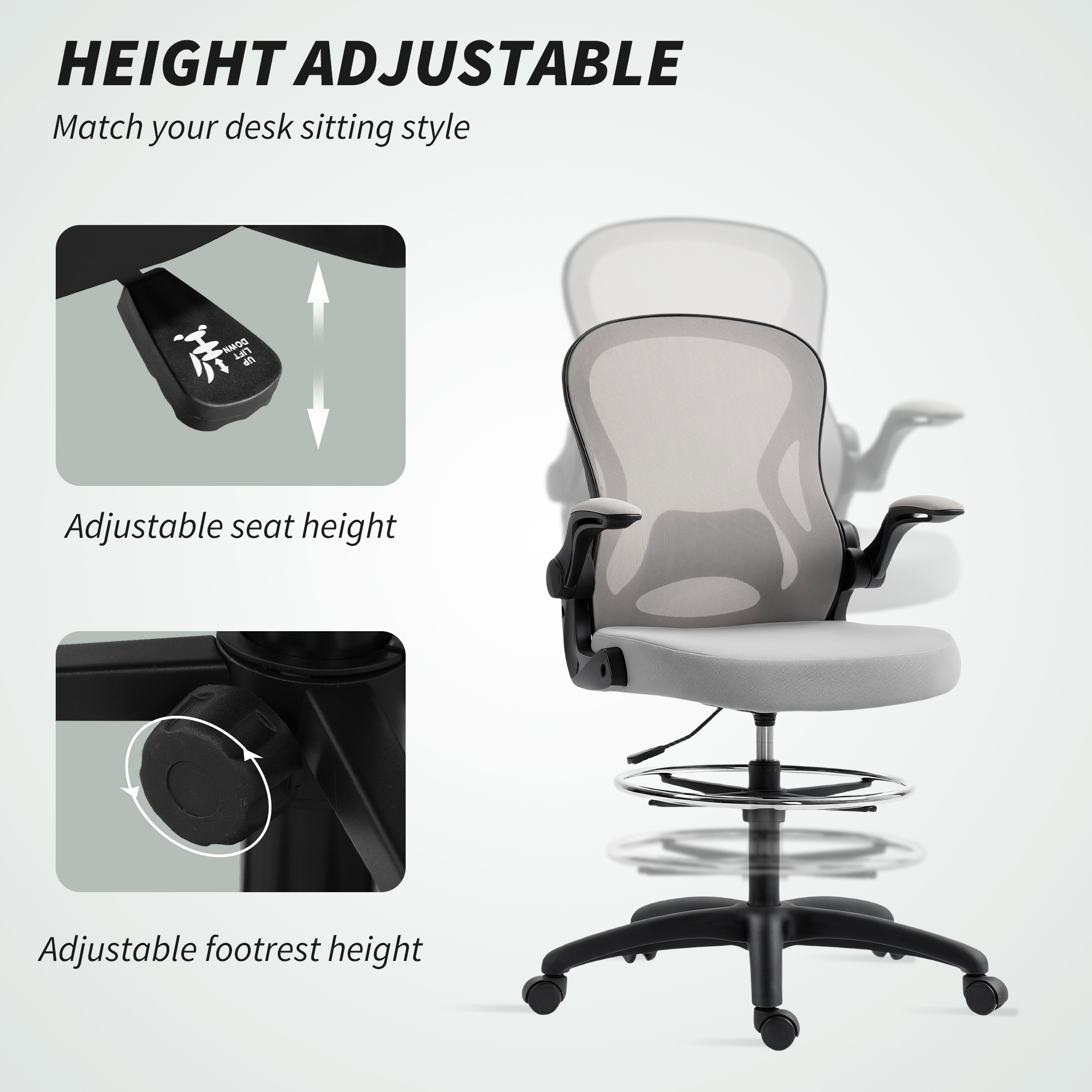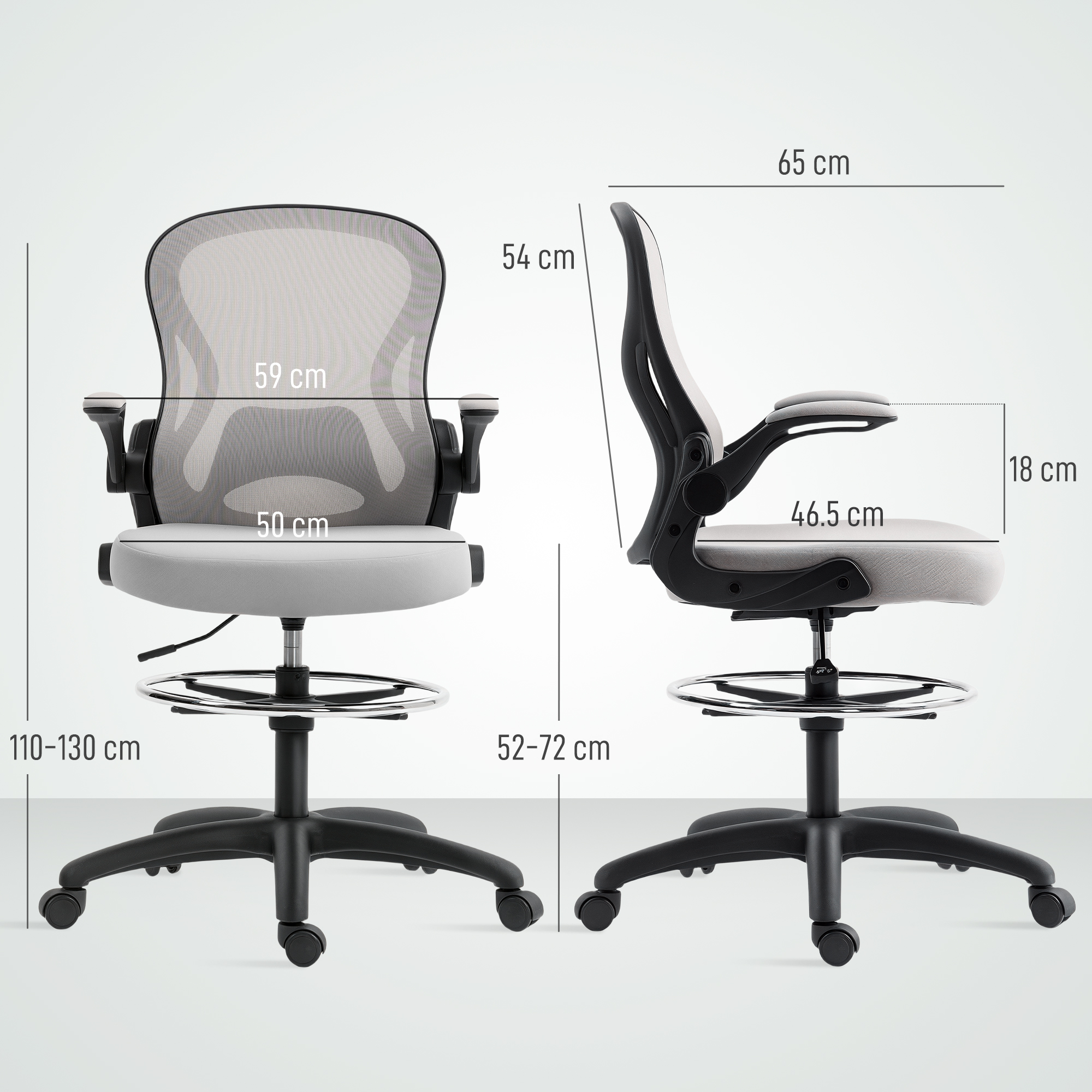 This mesh office chair, from Vinseto, comes in a draughtsman design - great for working at higher levels. Adjust the height between 52-72 cm easily, thanks to the under-seat lever. The padded seat, curved mesh back, flip-up arms and five-wheeled base make it a pleasure to sit on and use, supporting you as you work. Adjust the bottom bar to rest your lower body comfortably. Tall surfaces? No problem!