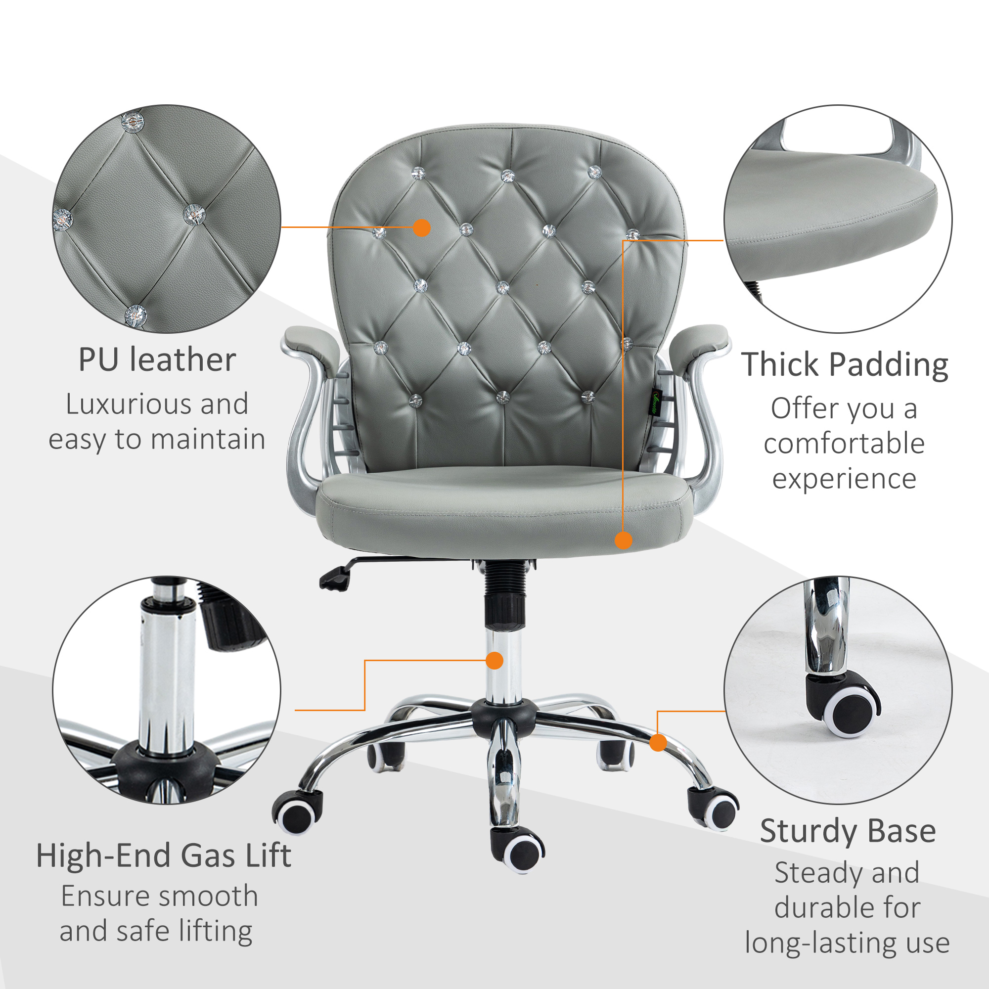 Inject a touch of glam and sophistication into your work day with this desk chair from Vinsetto. The computer chair is ergonomic with a thick padded cushion, a high and slightly-curved back, high armrests and an adjustable height. Wrapped in soft PU upholstery over the strong and supportive frame, the swivel chair is finished with crystal tufting on the back for a glamorous finishing touch and a 360° swivel base with five wheels for easy movement. A sparkling addition to your home office.