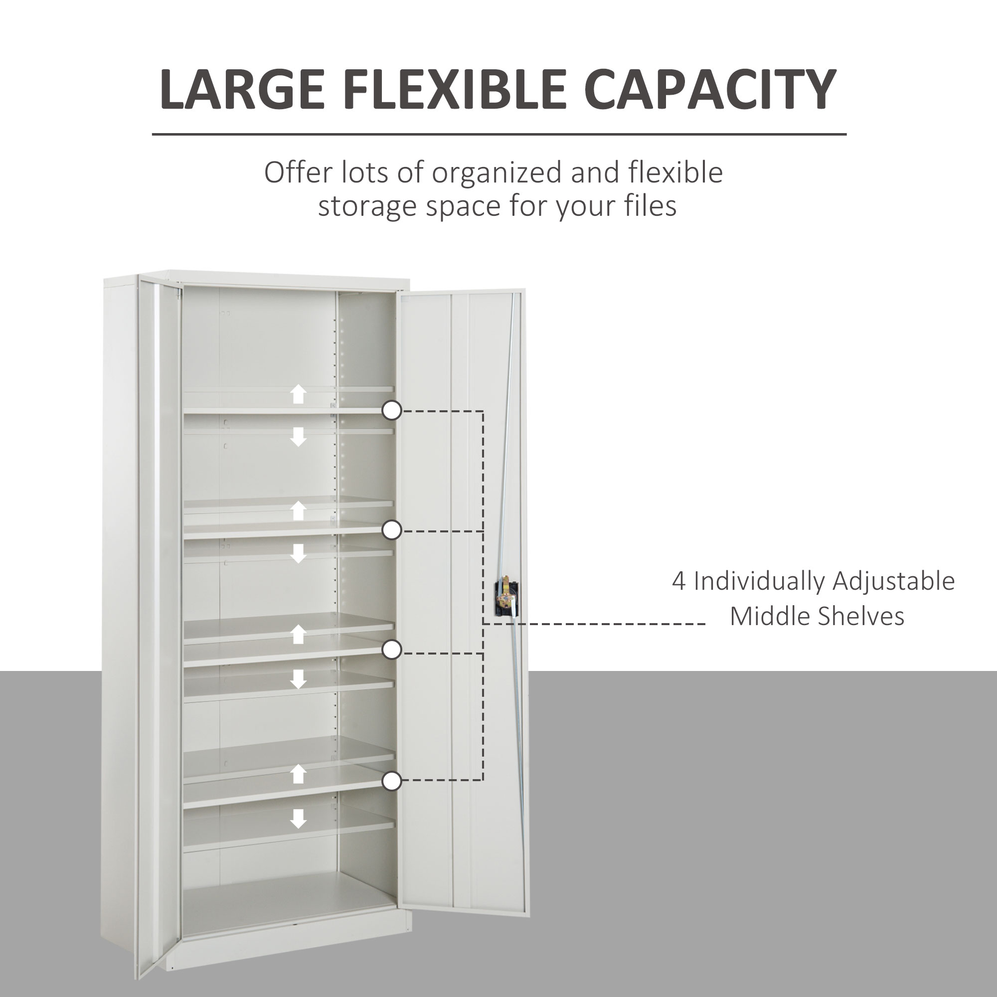With this lockable filing cabinet from Vinsetto, you can keep your important documents safe and organised. The quality filing cabinet is made from CRS, suitable for a range of uses, as workshop, warehouse or production facility, office and more. The individually adjustable shelves divide the interior space into 5 compartments and offer spacious storage options. The sleek powder-coated finish with elegant cream white colour is easy to incorporate into any office or study concept.