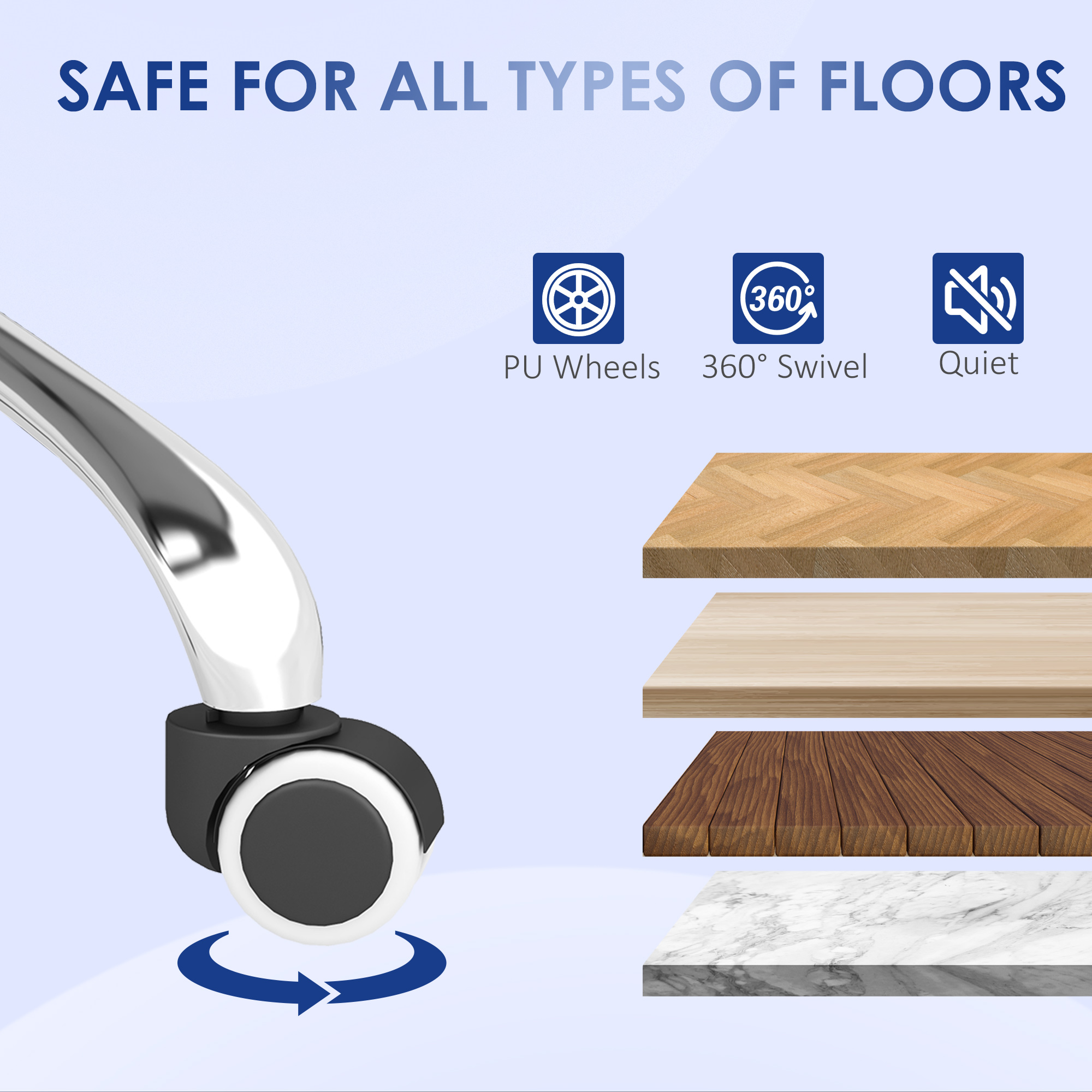 - Castors wheels suitable for wood, laminate, tile and slate floors
