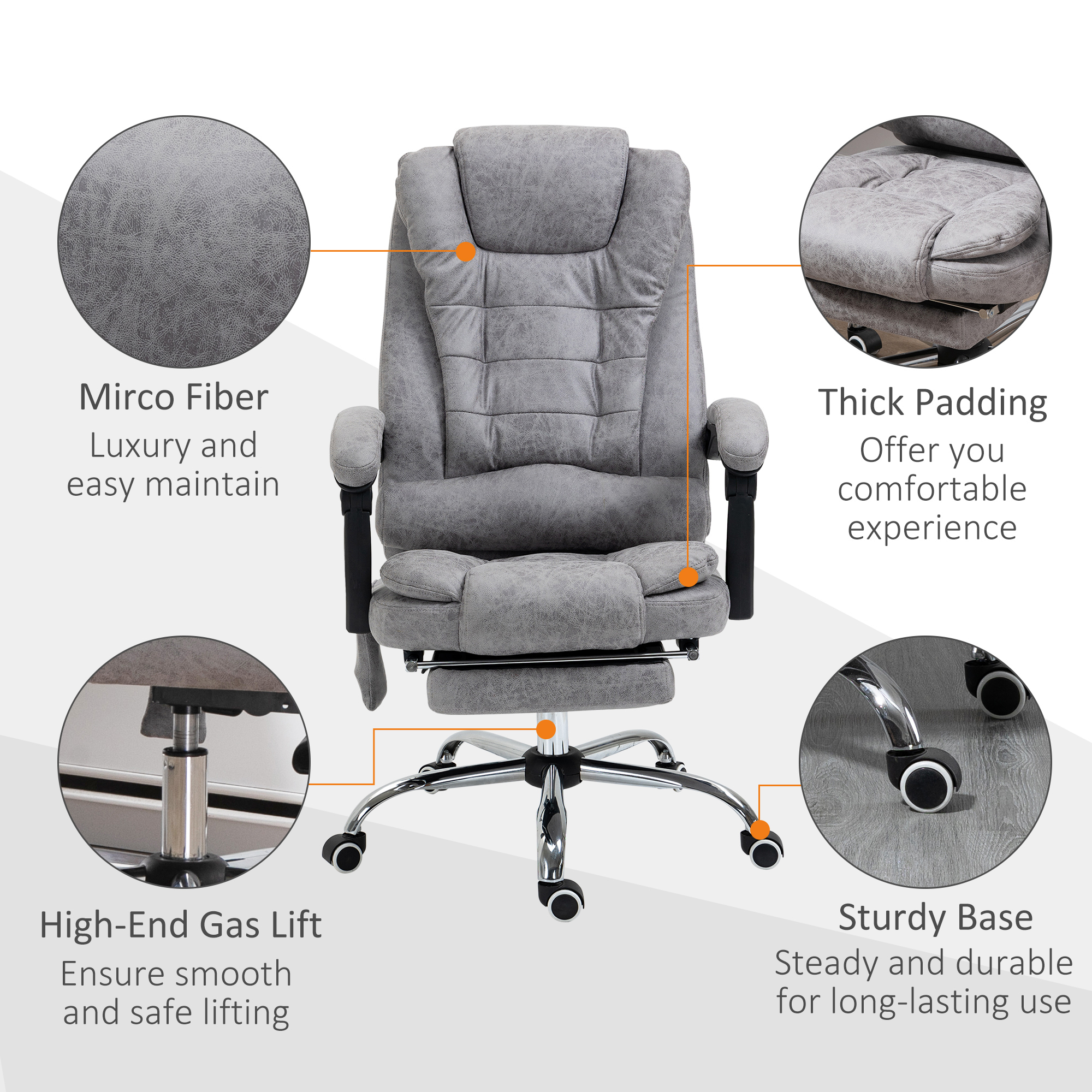 Work and relax, with this Vinsetto massage office chair. Wrapped in smooth and stylish microfibre upholstery, this computer chair is great to sit on and look at! But, most importantly, it has six heated massage points - four on the back, two on the seat: simply turn on the remote and relax. The seat gives wide sitting room, a high back and arms for support. With a 135° reclining backrest, finished with a manual footrest to elevate your lower body with ease.