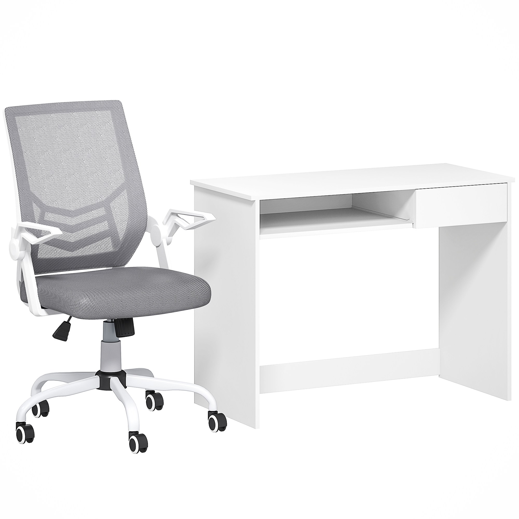 Transform your workspace into a realm of ultimate productivity and style with our modern PC chair and work desk set! Elevate your work experience with the writing desk. Featuring a keyboard tray and a drawer, it saves a lot of desktop space. Glide effortlessly on your creative journey with the mesh office chair, boasting swivel wheels and adjustable height for a personalized touch. Transform your home office into a creative, focused space with this practical set.