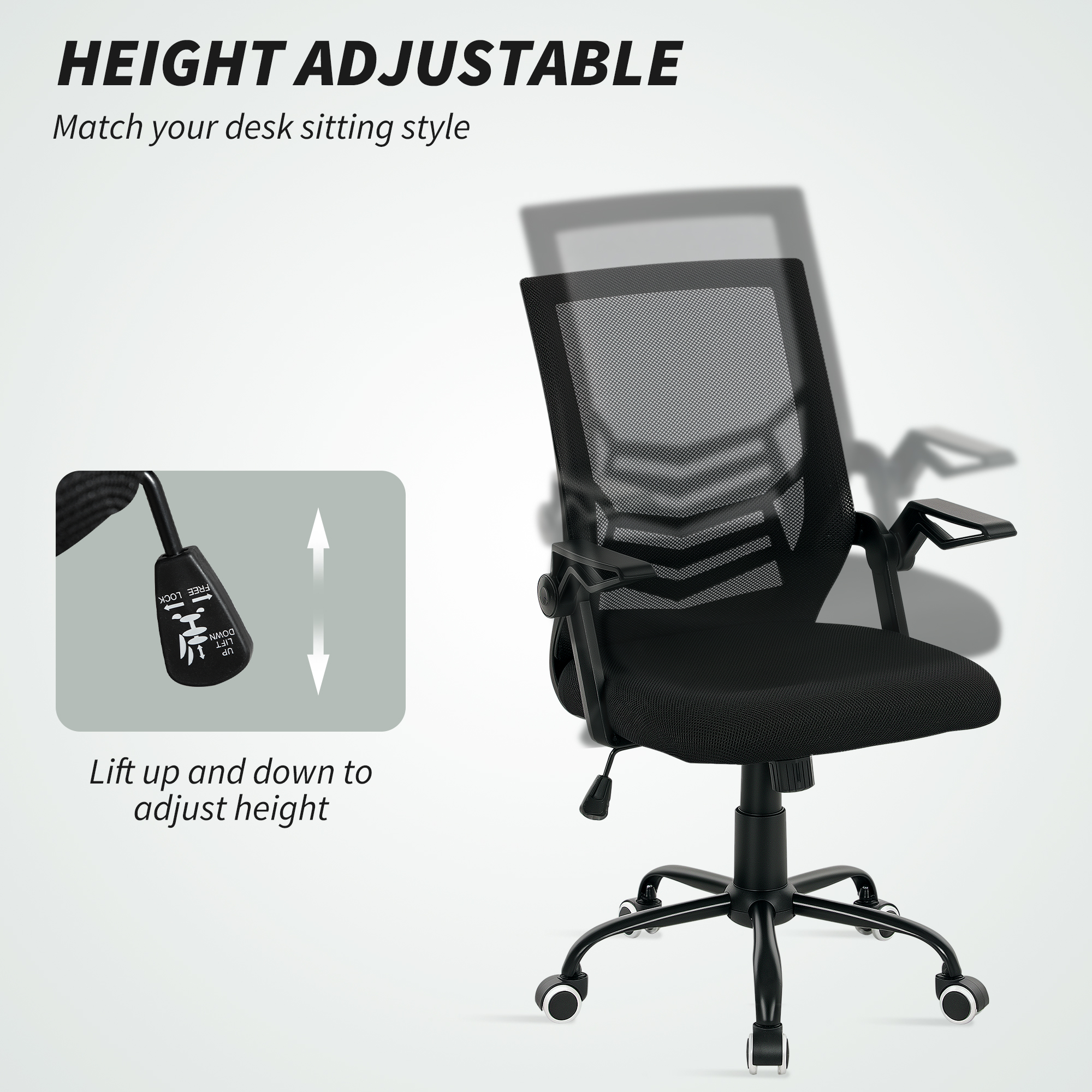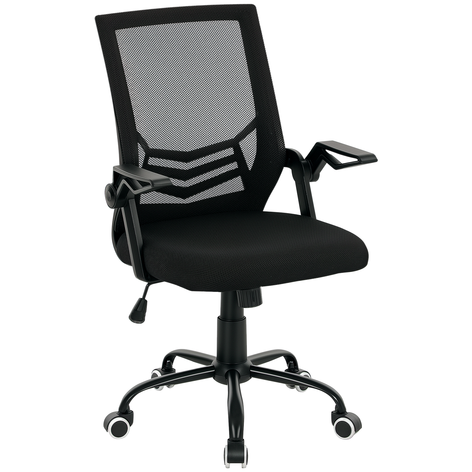 - Flip-up armrests allow chair to slot in under desk
