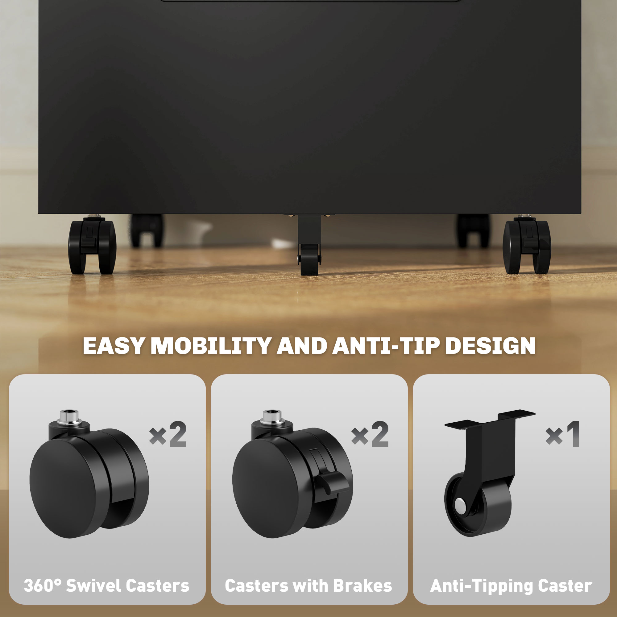 - A middle caster prevents tipping for safety