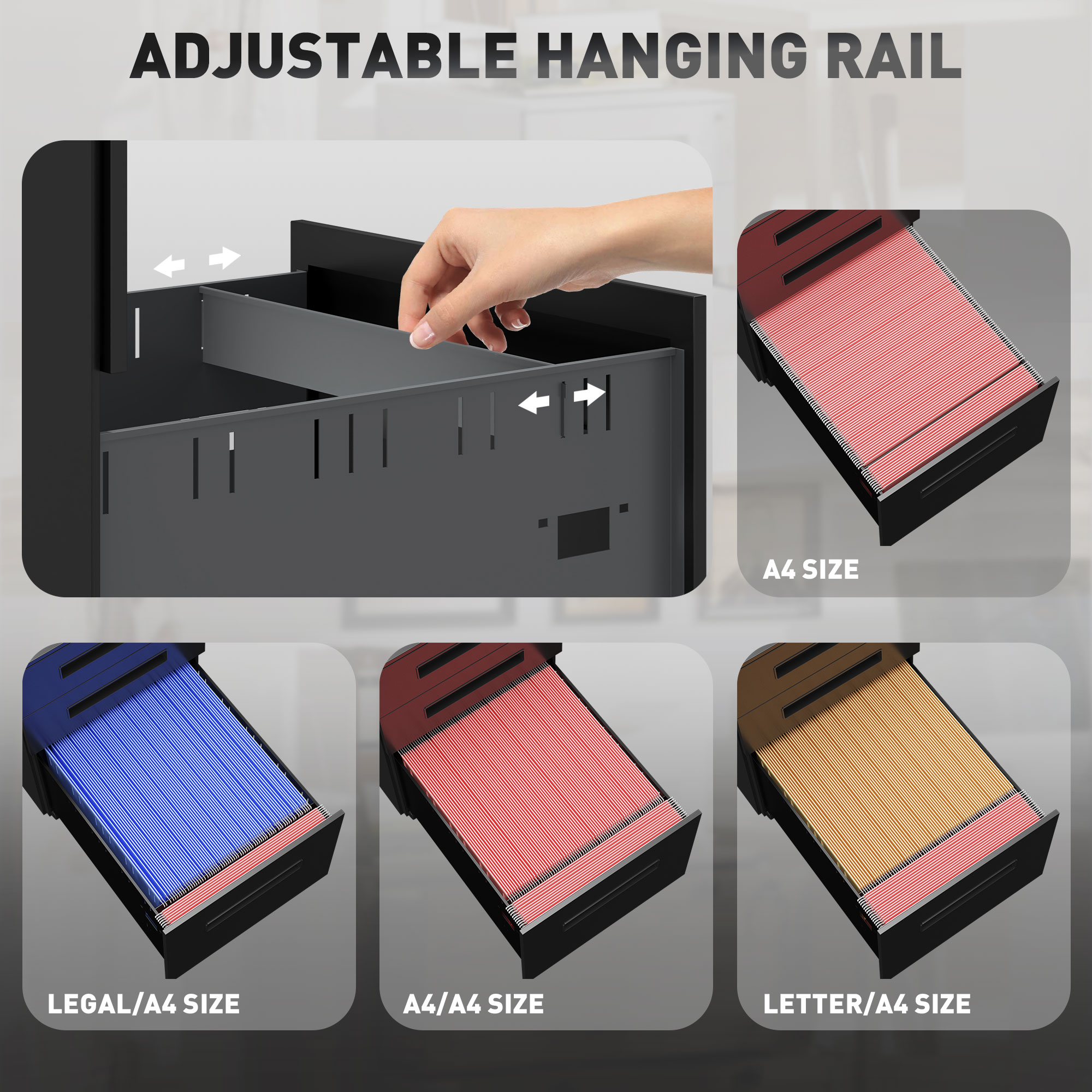 - Adjustable hanging rail in large drawer for three file sizes
