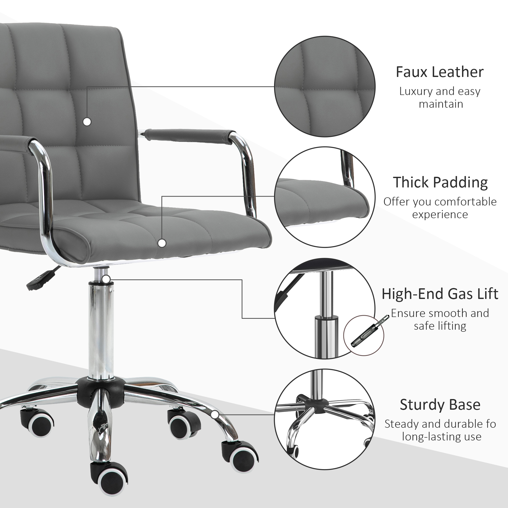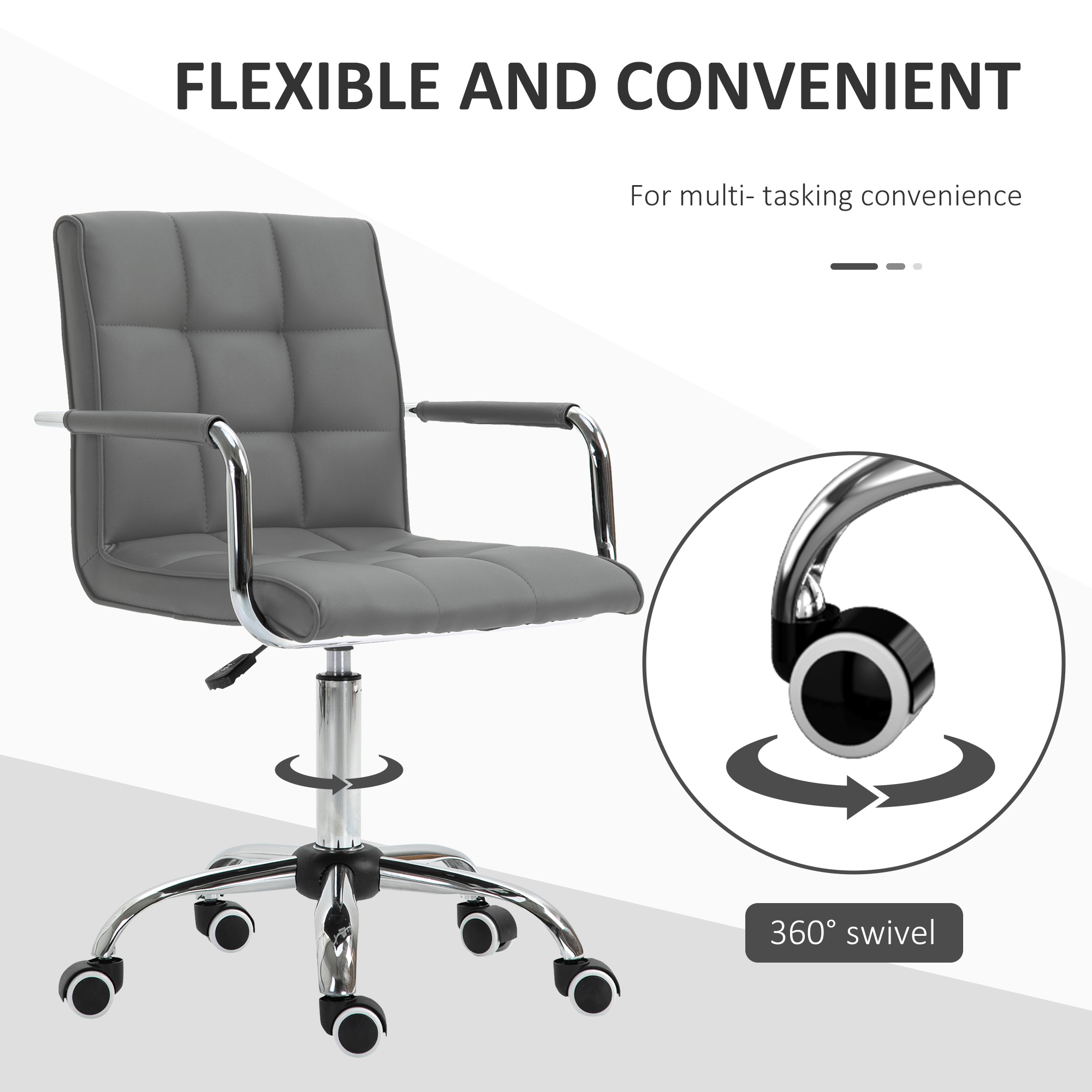 Let the effortless combination of style and comfort lead the way in your home office - choose this swivel chair from Vinsetto. Padded seat and back, with fixed armrests and a high back offer comfort and support. The height is adjustable via the under-seat lever. A heavy-duty base for support is fitted with five wheels for easy movement. Work wherever, whenever.