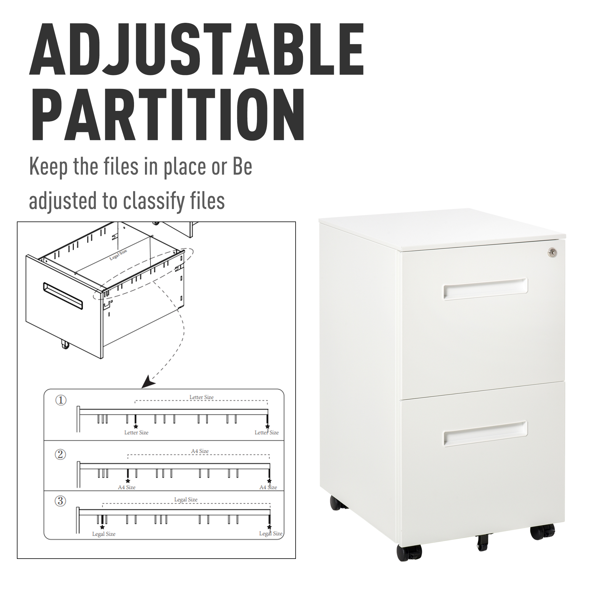 - Adjustable hanging rail in the drawer for three file sizes