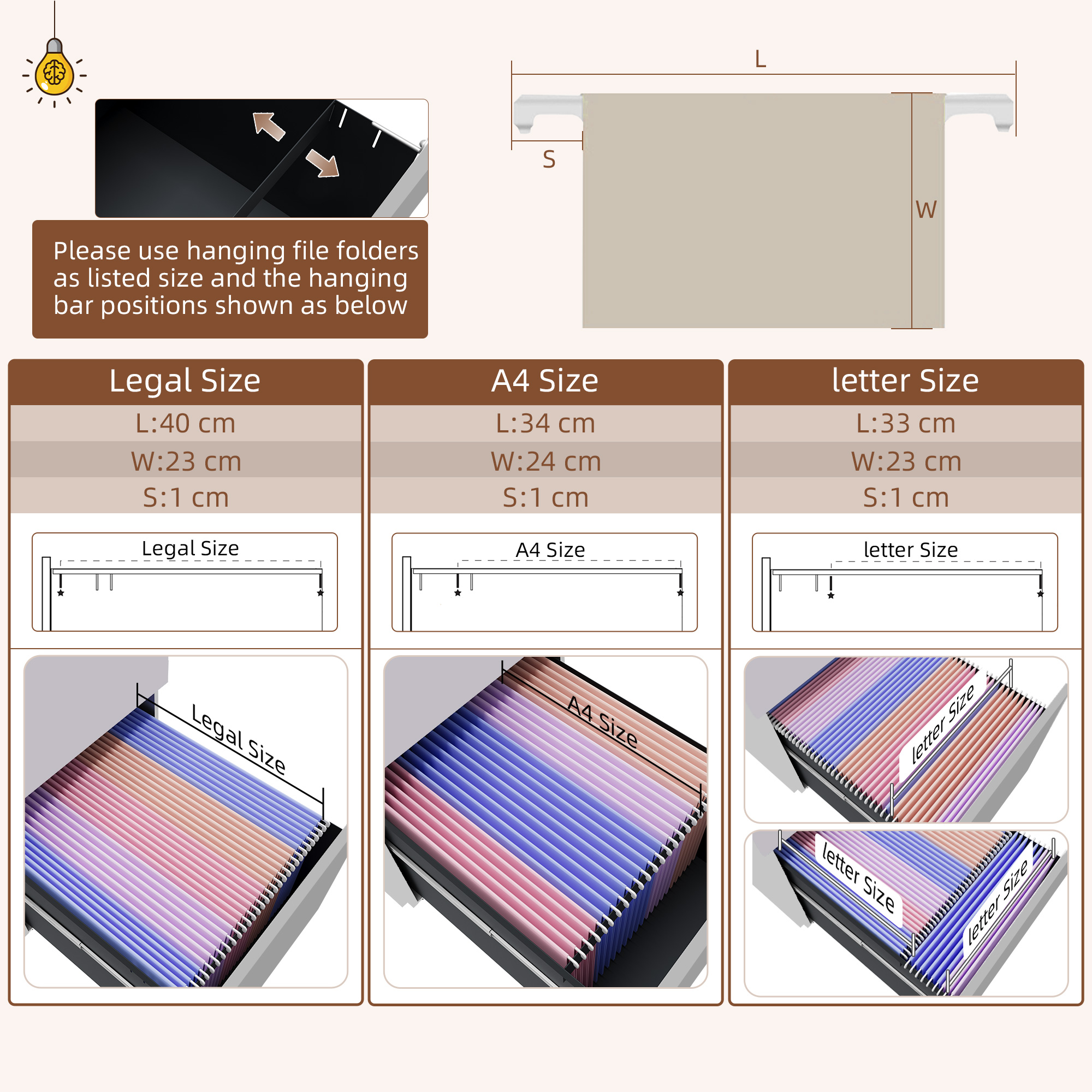 - Adjustable hanging bar in bottom bar for letter, A4 and legal sized files