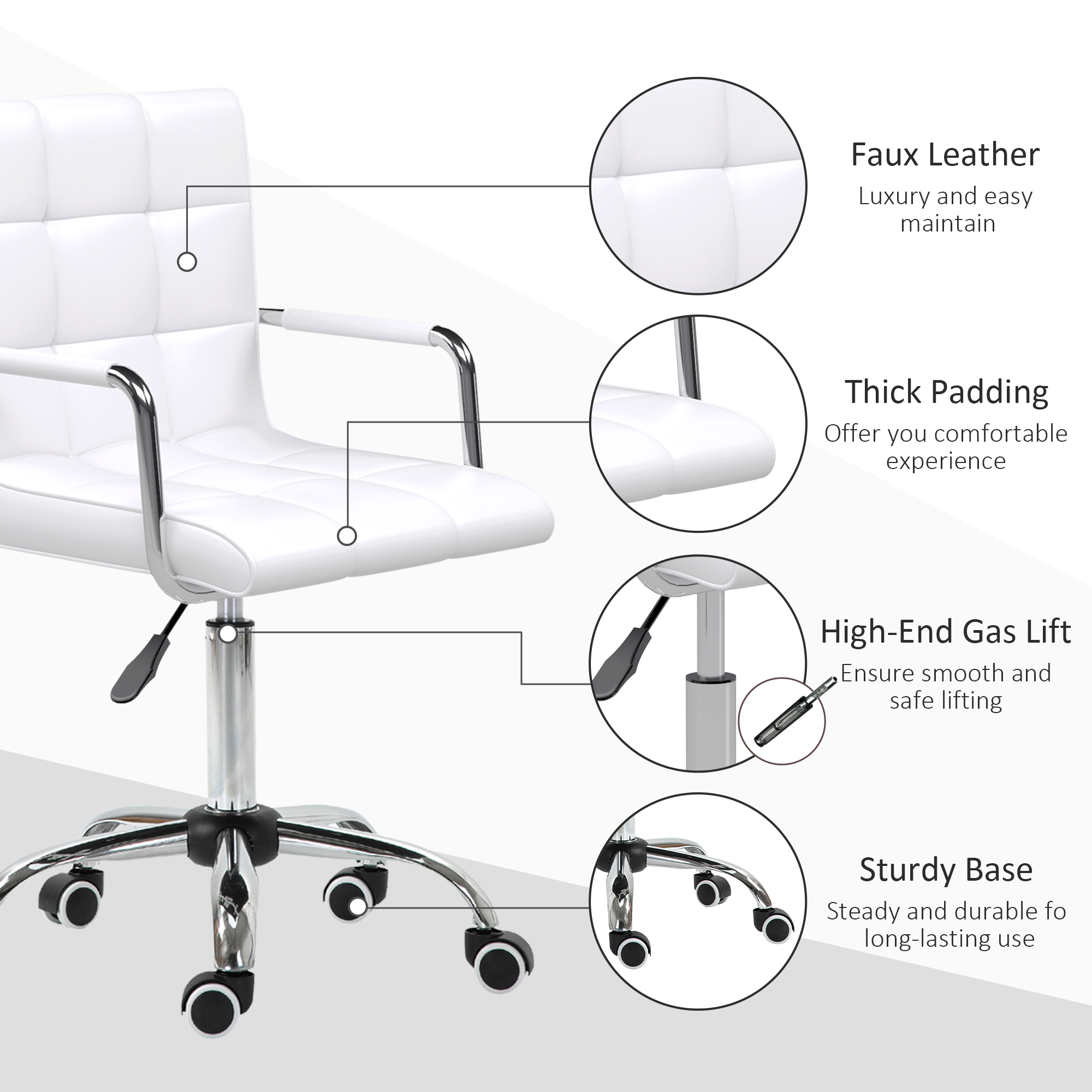 Let the effortless combination of style and comfort lead the way in your home office - choose this swivel chair from Vinsetto. Padded seat and back, with fixed armrests and a high back offer comfort and support. The height is adjustable via the under-seat lever. A heavy-duty base for support is fitted with five wheels for easy movement. Work wherever, whenever.