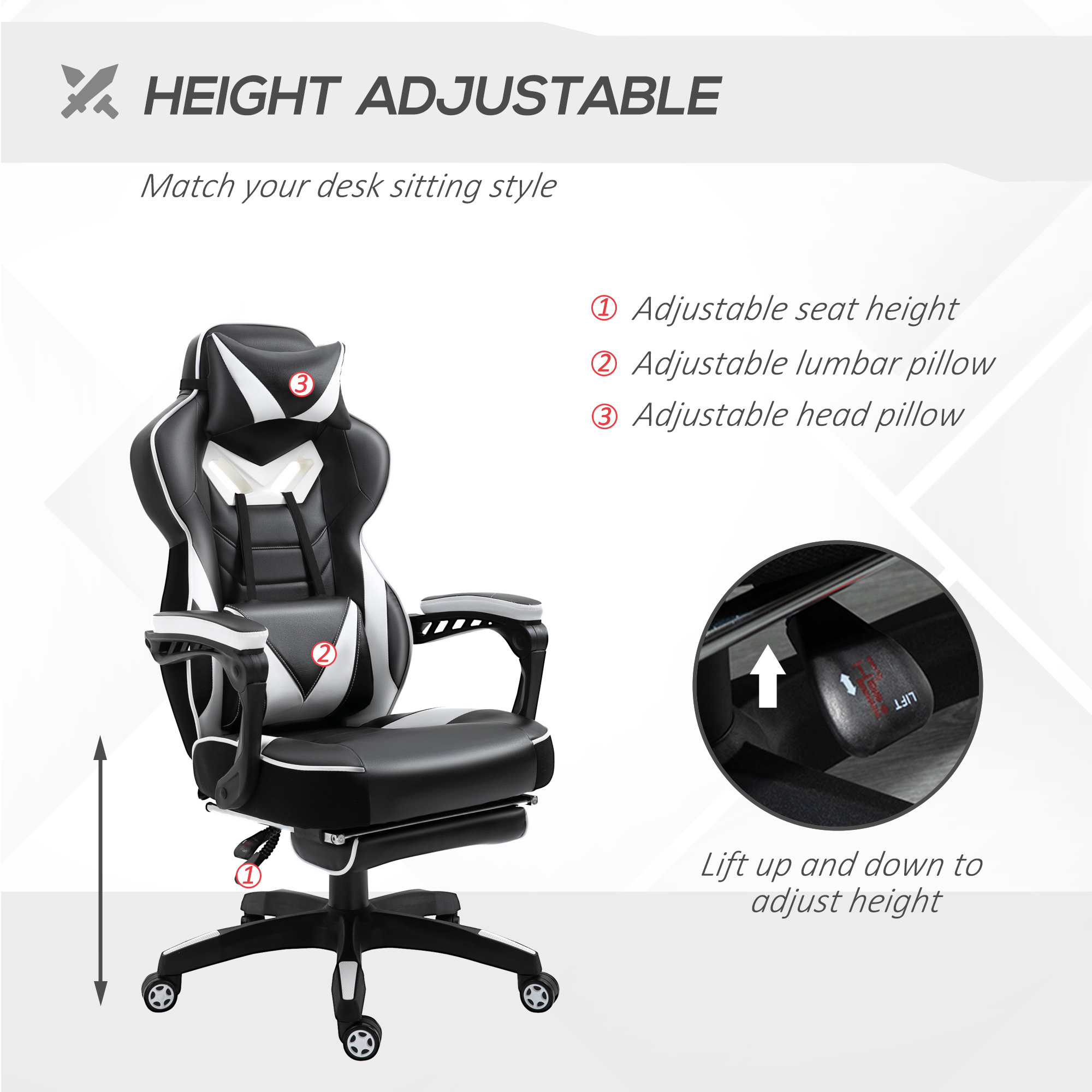 Fulfil your need for some serious style with this gaming chair with footrest from Vinsetto. It's fitted with thick sponge for comfort and wrapped in sleek faux leather with contrasting panels. Comfortable in design, it features a high back, armrests, a five-wheel base and can swivel around 360°. Whether it's work or play, the gaming chair for adults is a good choice.