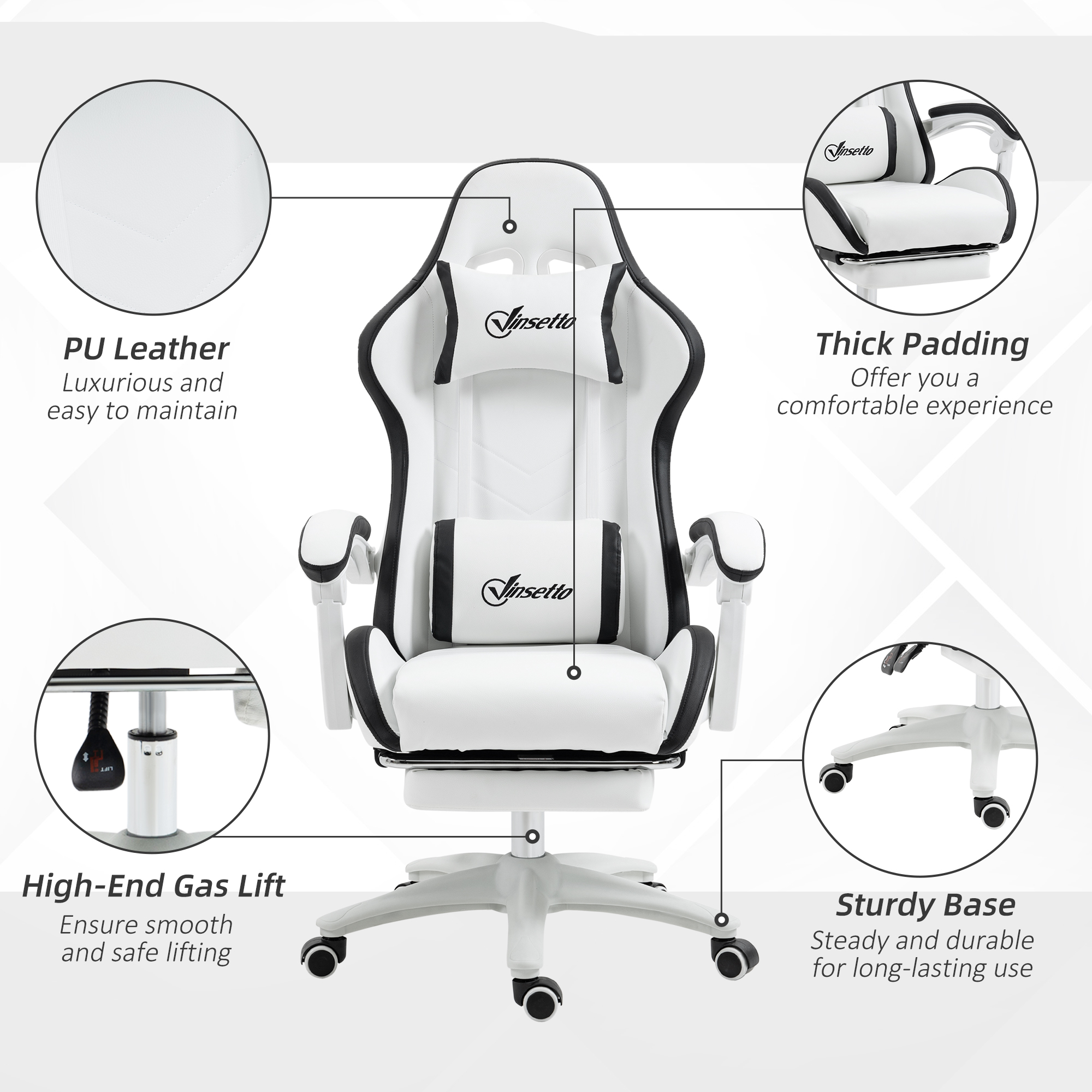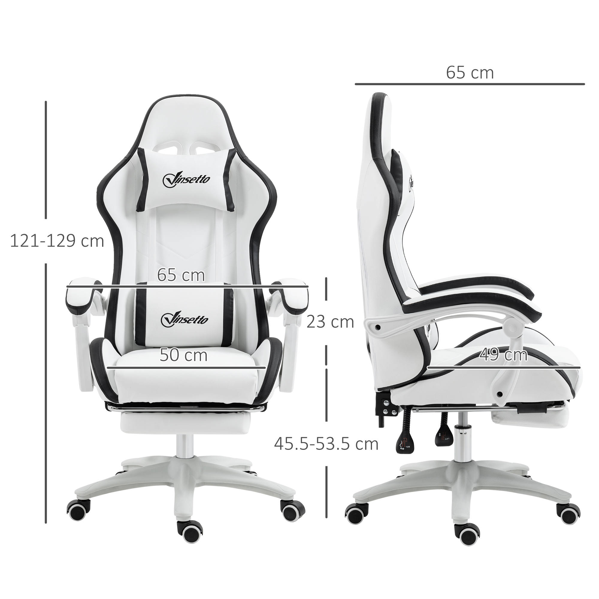 Keep comfortable and focused in the game: do it with this Vinsetto gaming chair. Faux leather upholstery is sleek, with a coloured border all over for a touch of impact. Padded all over, with head and lumbar pillow included for comfort. The back reclines to a maximum 135°, with a pull-out footrest to elevate the lower body. Adjust the height between 45.5cm and 53.5cm, to game at a position best for you.