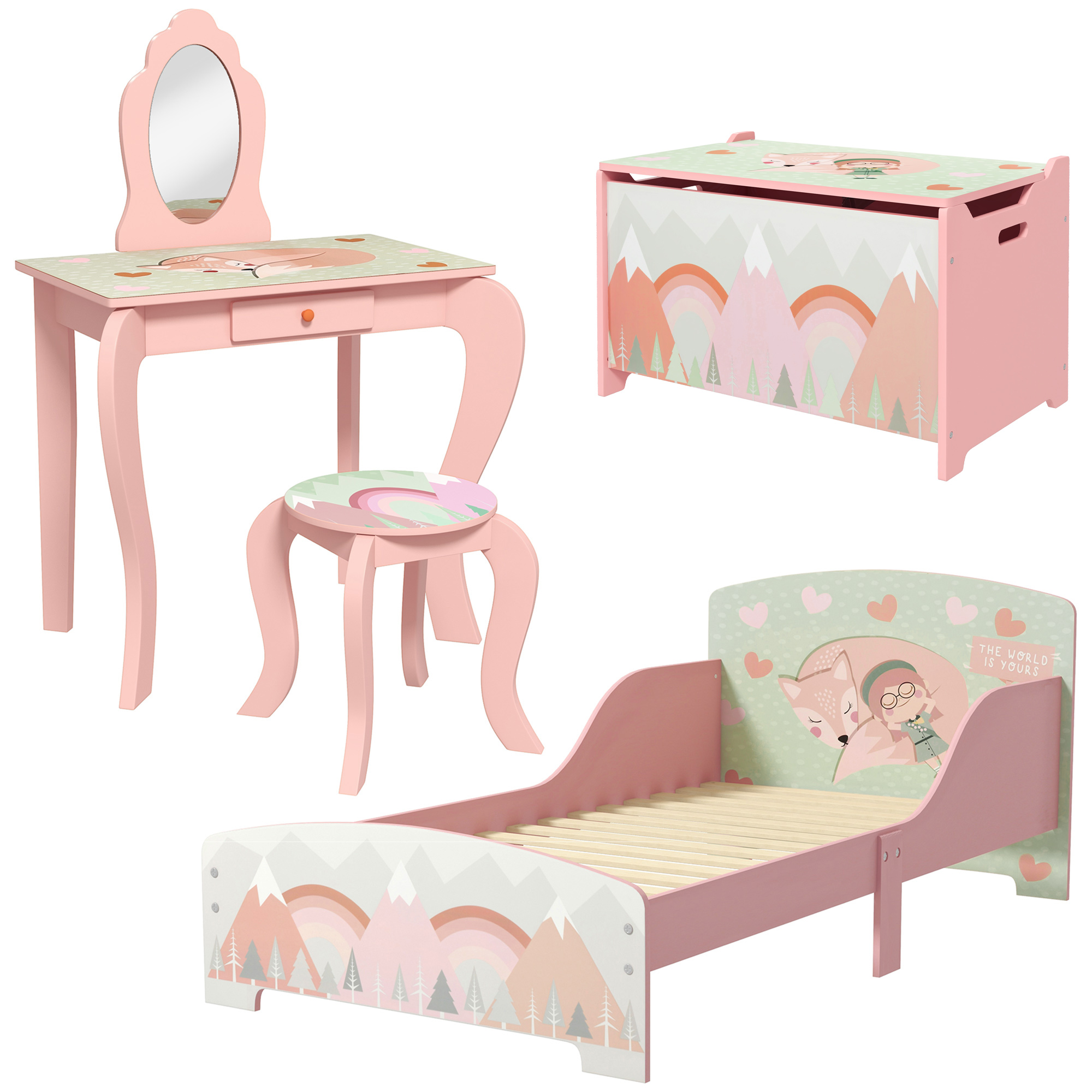 Uplift your child's room with our adorable ZONEKIZ kids dressing table, bed and storage chest. Their cute and vibrant design adds a playful touch to any room. Kids can use the mirror to get ready in the mornings, practise their makeup, do their hair and more with our vanity table, kids bed is at a low height to easily get on and off and the storage chest offers generous storage space, whilst the siderails prevent falls. The series helps kids grow up healthily and also enlightens kids' wisdom.