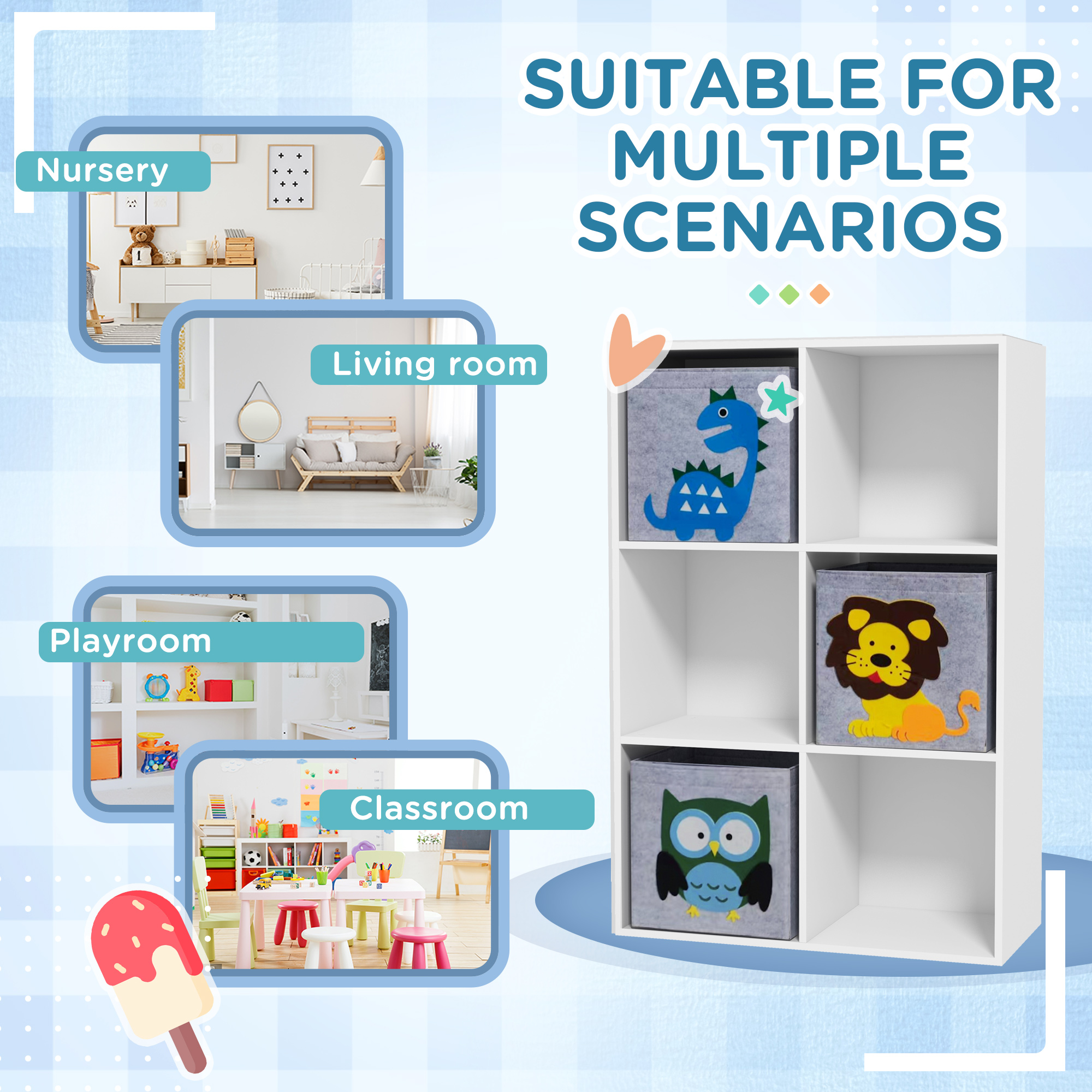 The solution to your child's messy room – this ZONEKIZ storage cabinet. Six spacious cubes offer plenty of space to display and organise toys and other bits, so there's less clutter around. A stable design, it sits securely on the floor and includes an anti-tip device for safety. Straightforward assembly saves time and effort, you'll have it set up quickly and ready to use. Finished with cute cartoon-like animals on the front, it creates a fun and vibrant atmosphere for your child's space.